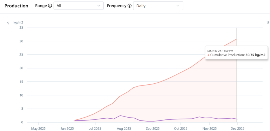 These benchmarks are based on full-year production cycles; in comparison, the 2025 crop achieved 30.75 kg/m² in 238 days (~7.8 months), approximately 3.5 months shorter than a standard cycle.