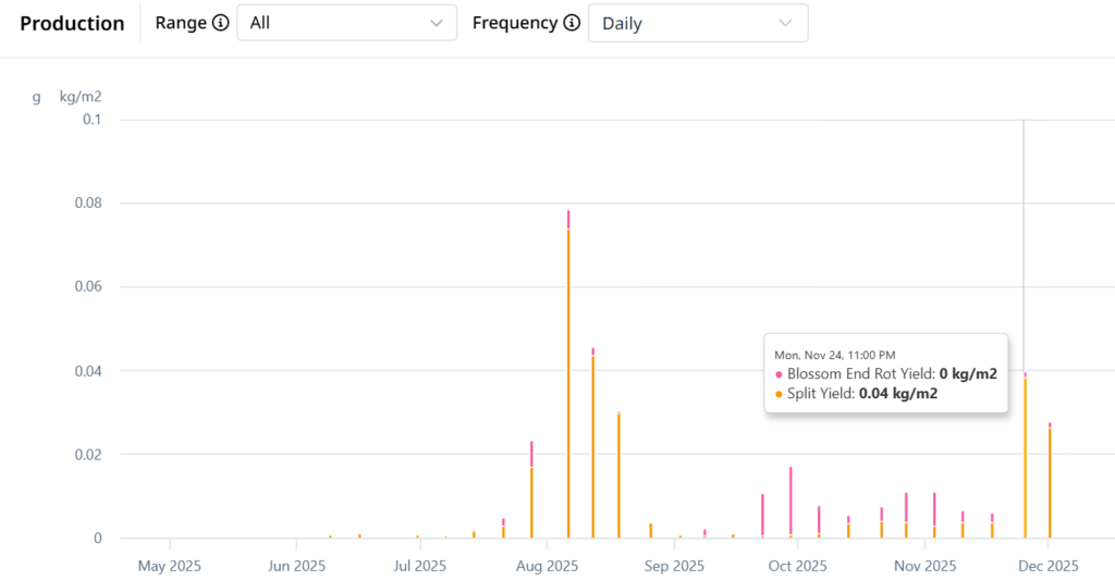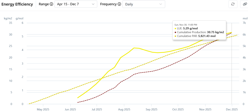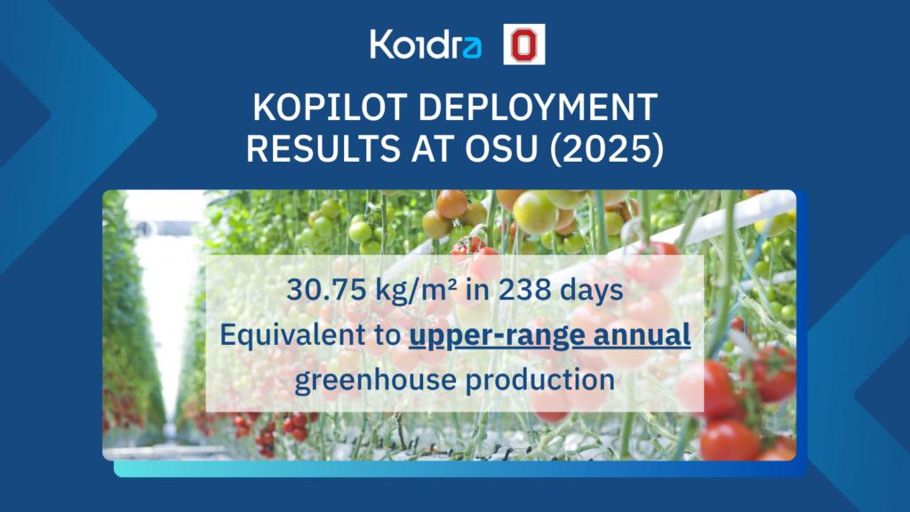 In 2025, Koidra’s KoPilot continued to control the climate and irrigation in a Venlo-style greenhouse compartment located at the Controlled Environment Agriculture Research Complex (CEARC) of The Ohio State University (Columbus, OH, USA). We achieved significantly higher yield and LUE (light use efficiency) compared to the trial last year. Notably, the cumulative yield of 30.75 kg/m² was achieved in a 238-day growing cycle (April 15 – December 8), which is approximately 3.5 months shorter than a standard full-year production cycle. This yield already falls within the upper range of industry benchmarks for annual high-tech greenhouse production (27-33 kg/m²).